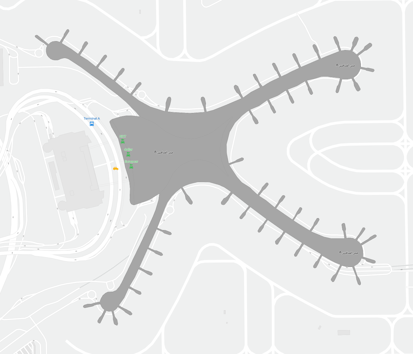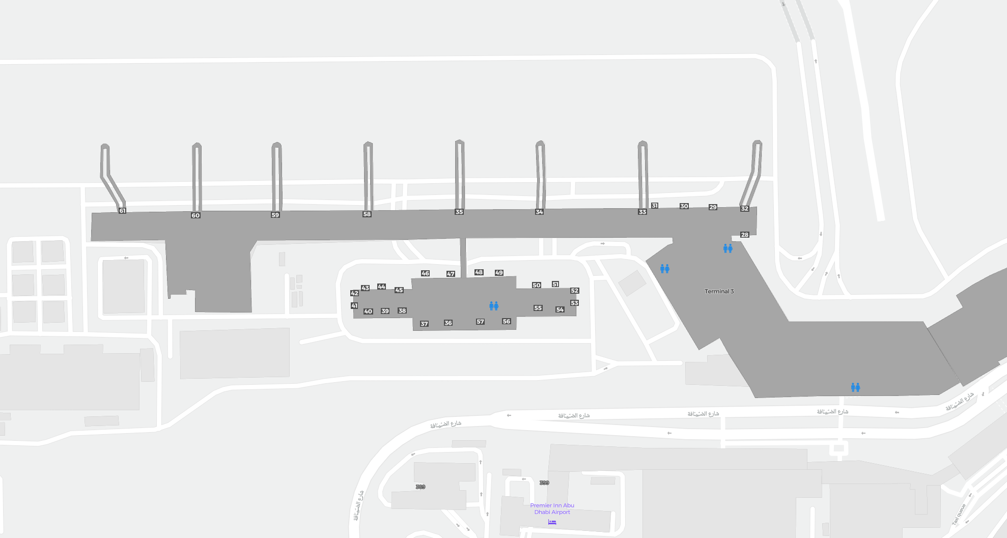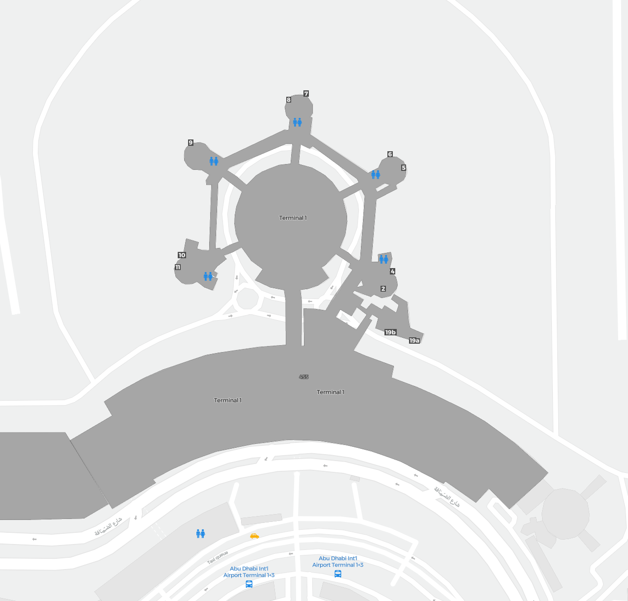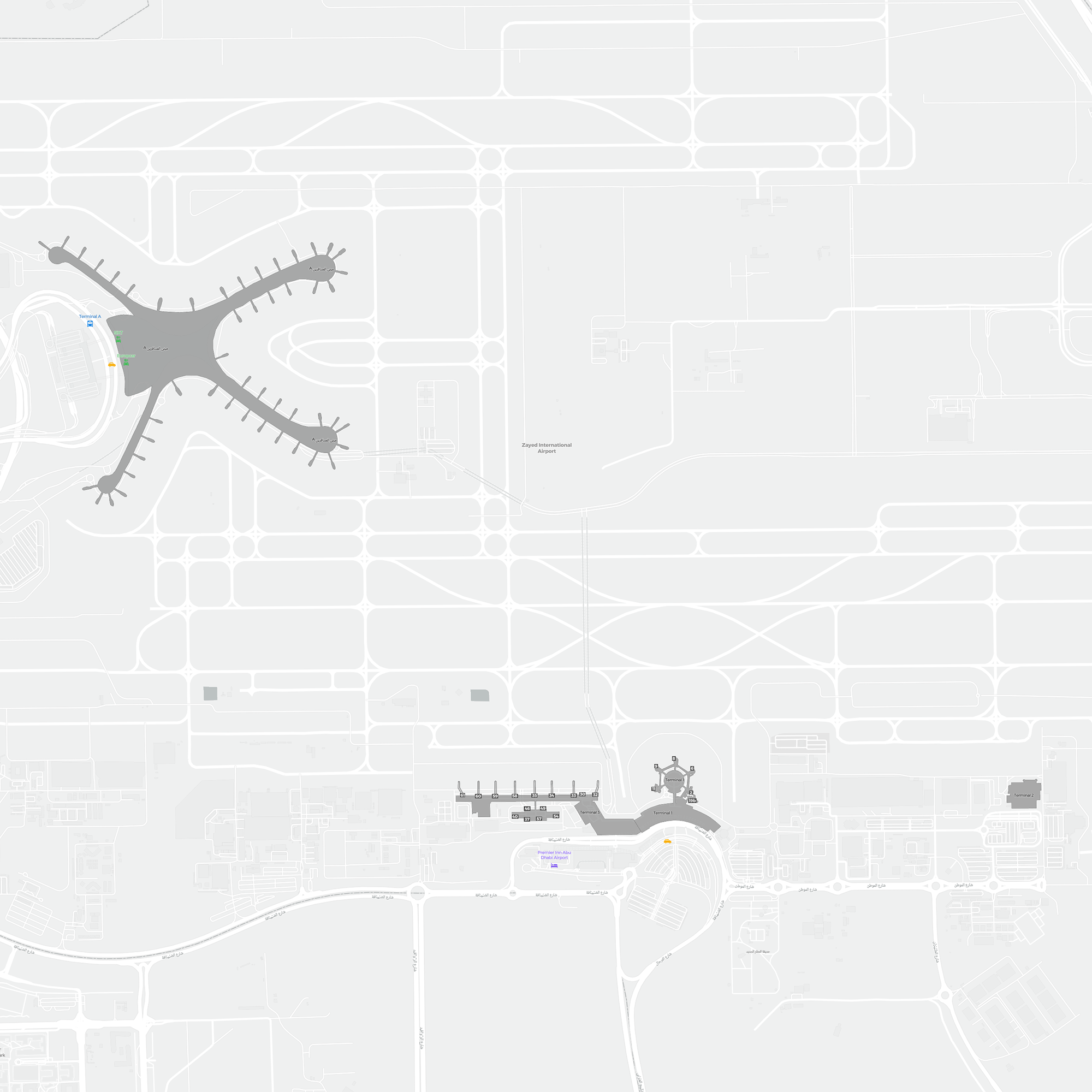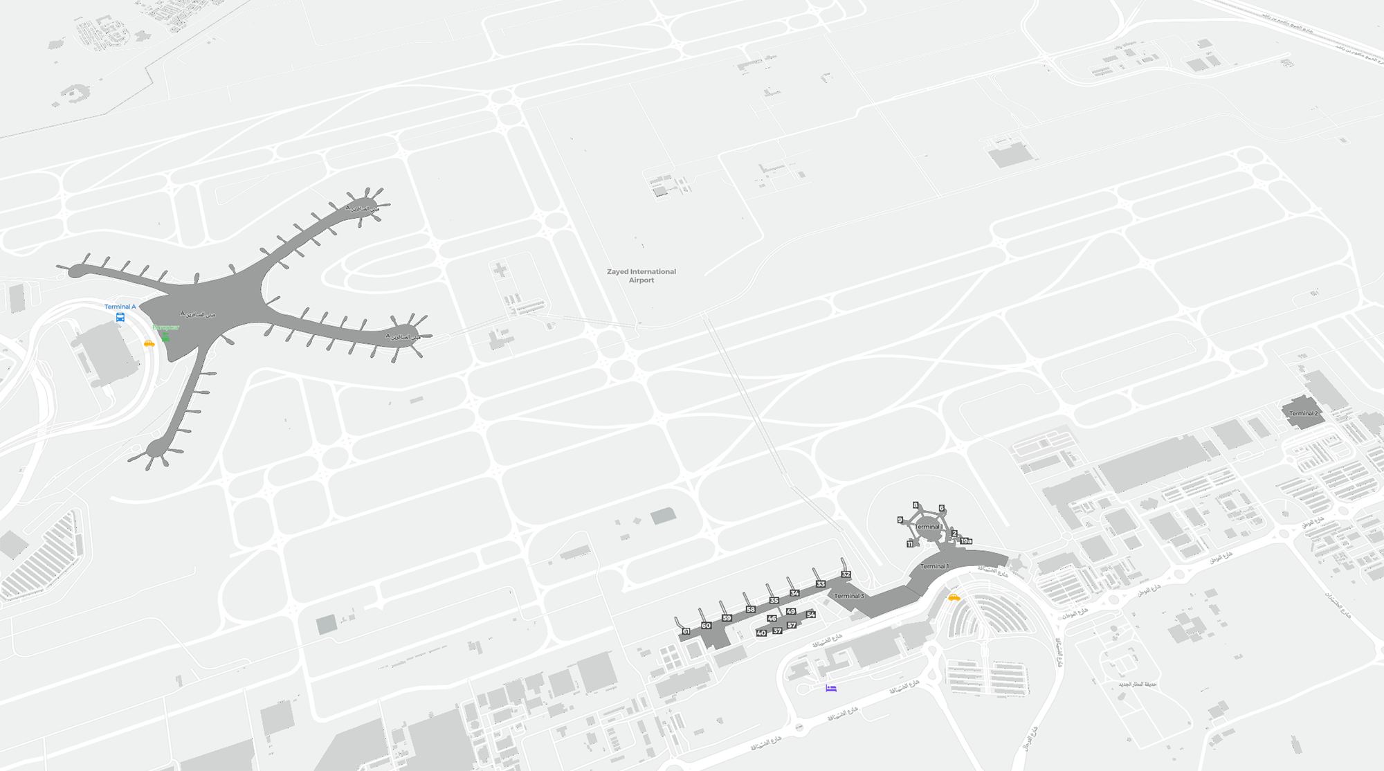 Tämä on zoomattava kartta Abu Dhabi (AUH). Kartta voi antaa yleiskuvan ulkoalueesta terminaaleineen, pysäköintialueineen ja joissakin lentokentissä myös porttien, autovuokrauspalveluiden ja muiden mukavuuksien tiedot, jos zoomaat sisään.