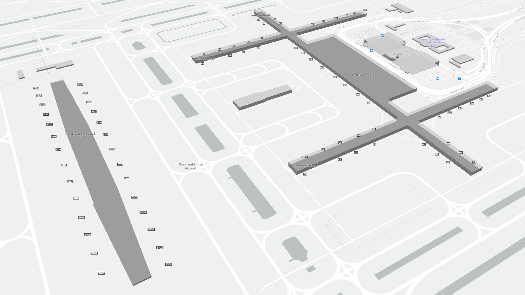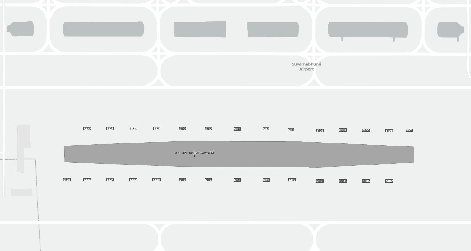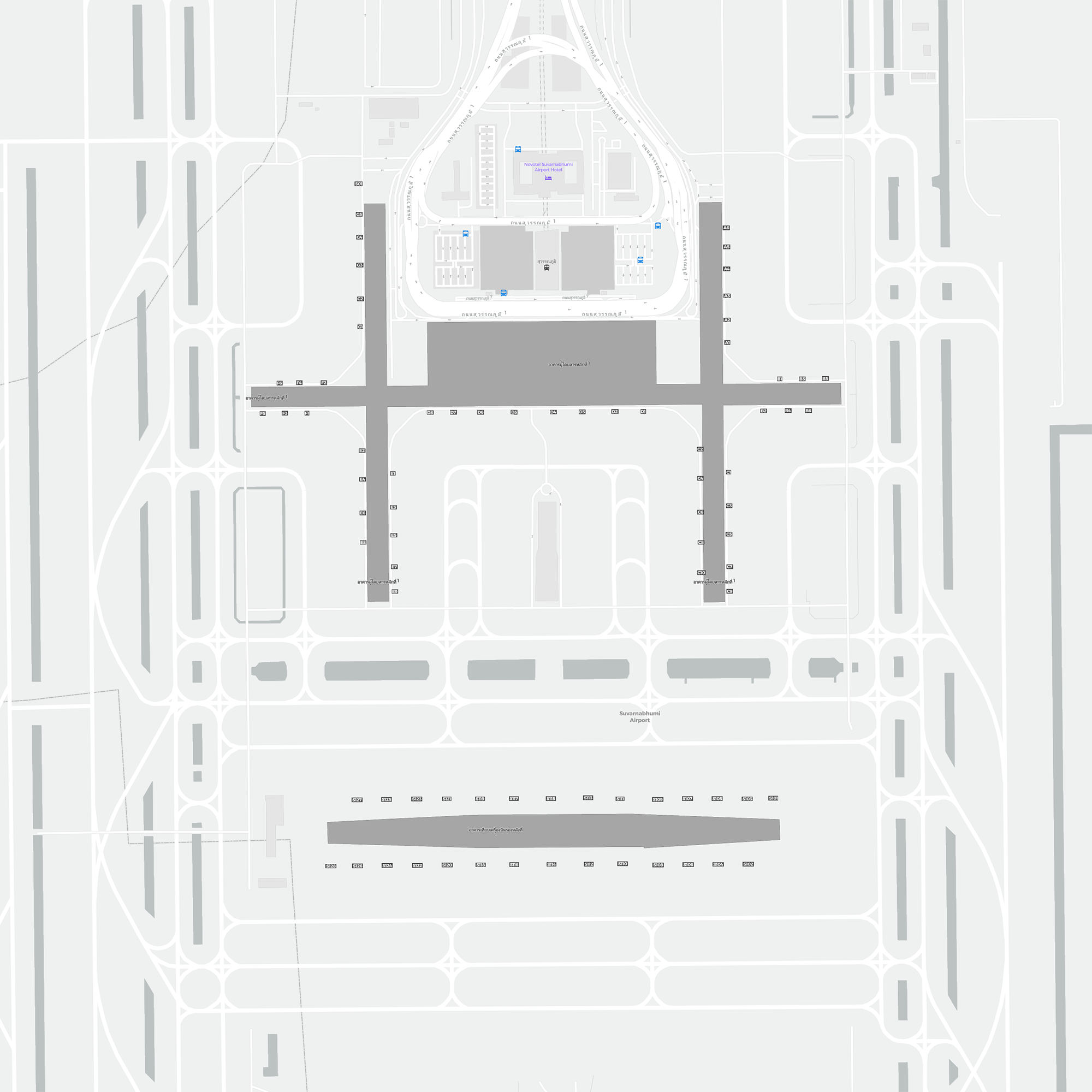 Tämä on zoomattava kartta Bangkok (BKK). Kartta voi antaa yleiskuvan ulkoalueesta terminaaleineen, pysäköintialueineen ja joissakin lentokentissä myös porttien, autovuokrauspalveluiden ja muiden mukavuuksien tiedot, jos zoomaat sisään.