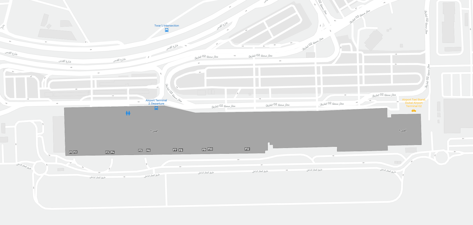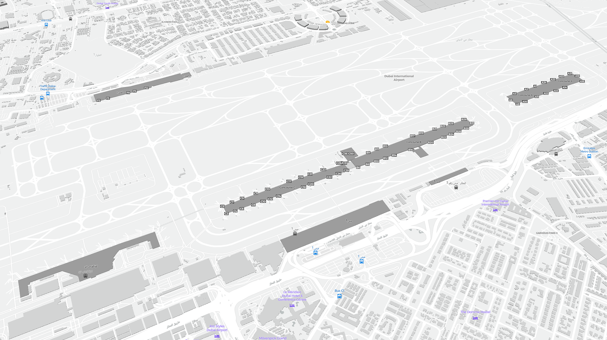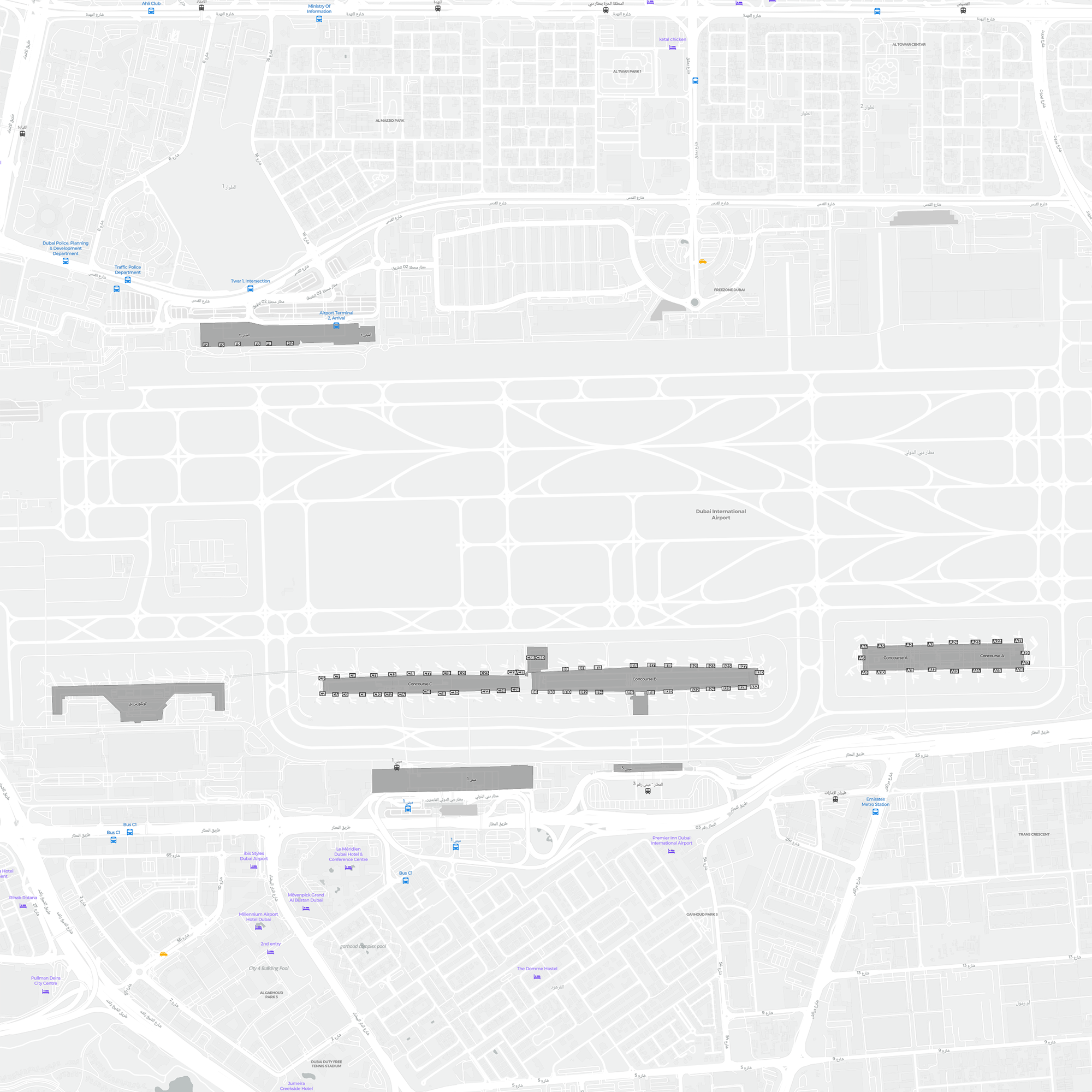 Tämä on zoomattava kartta Dubai (DXB). Kartta voi antaa yleiskuvan ulkoalueesta terminaaleineen, pysäköintialueineen ja joissakin lentokentissä myös porttien, autovuokrauspalveluiden ja muiden mukavuuksien tiedot, jos zoomaat sisään.