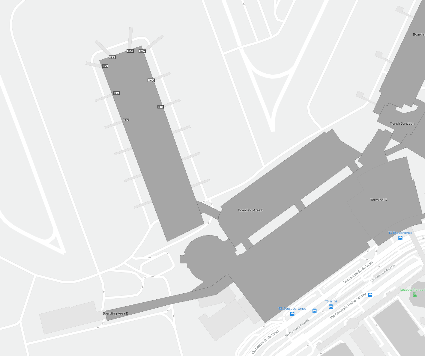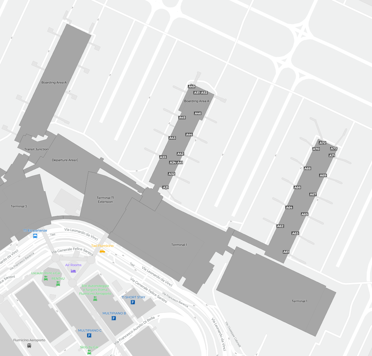 Tämä on zoomattava kartta Rooma (FCO). Kartta voi antaa yleiskuvan ulkoalueesta terminaaleineen, pysäköintialueineen ja joissakin lentokentissä myös porttien, autovuokrauspalveluiden ja muiden mukavuuksien tiedot, jos zoomaat sisään.
