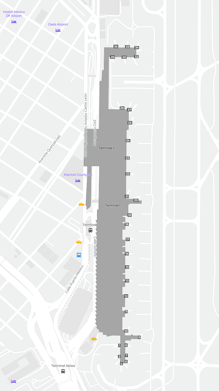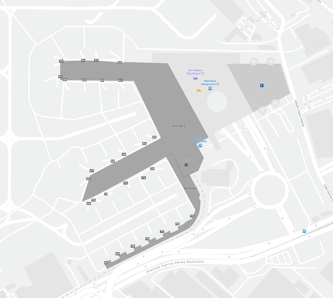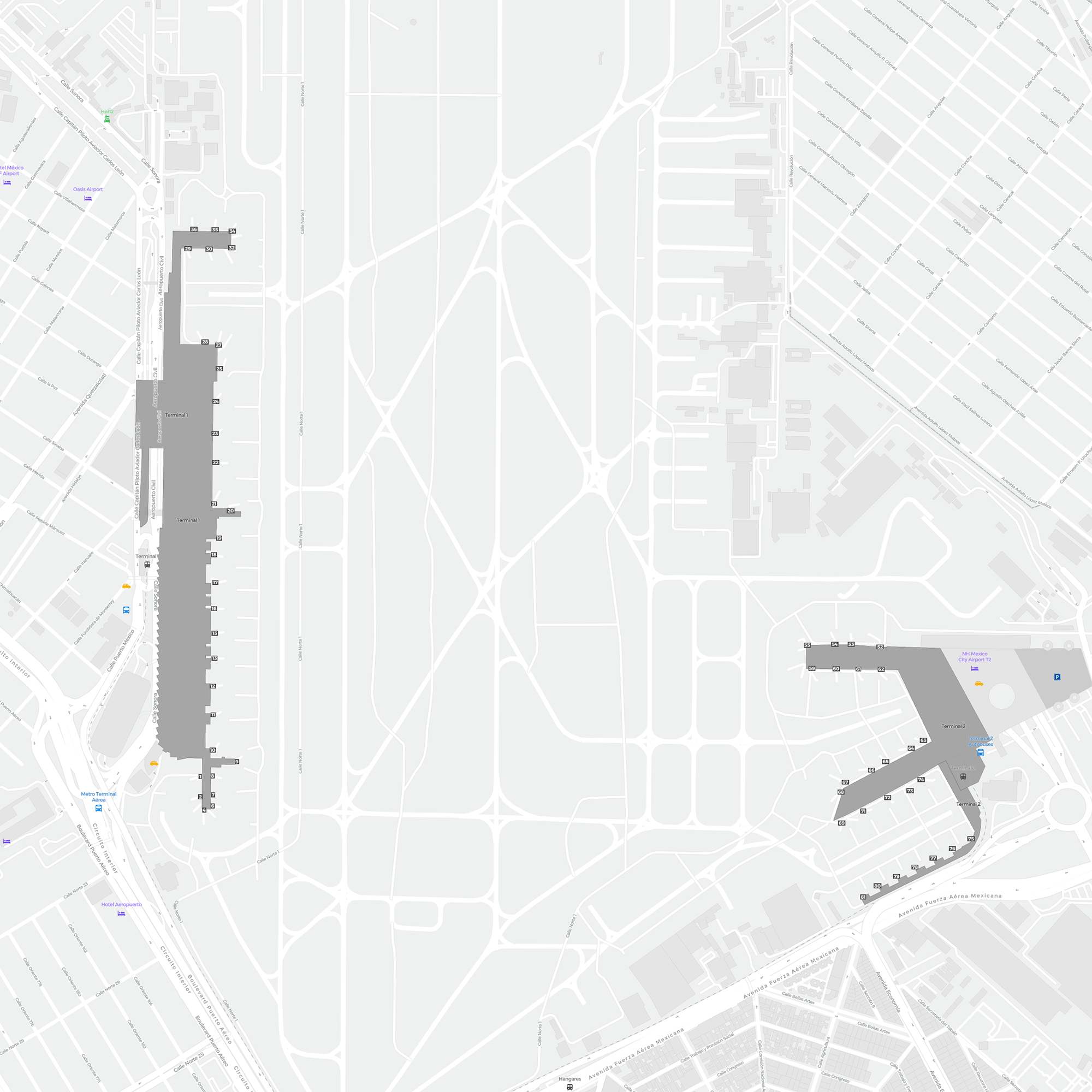 Tämä on zoomattava kartta Mexico (MEX). Kartta voi antaa yleiskuvan ulkoalueesta terminaaleineen, pysäköintialueineen ja joissakin lentokentissä myös porttien, autovuokrauspalveluiden ja muiden mukavuuksien tiedot, jos zoomaat sisään.