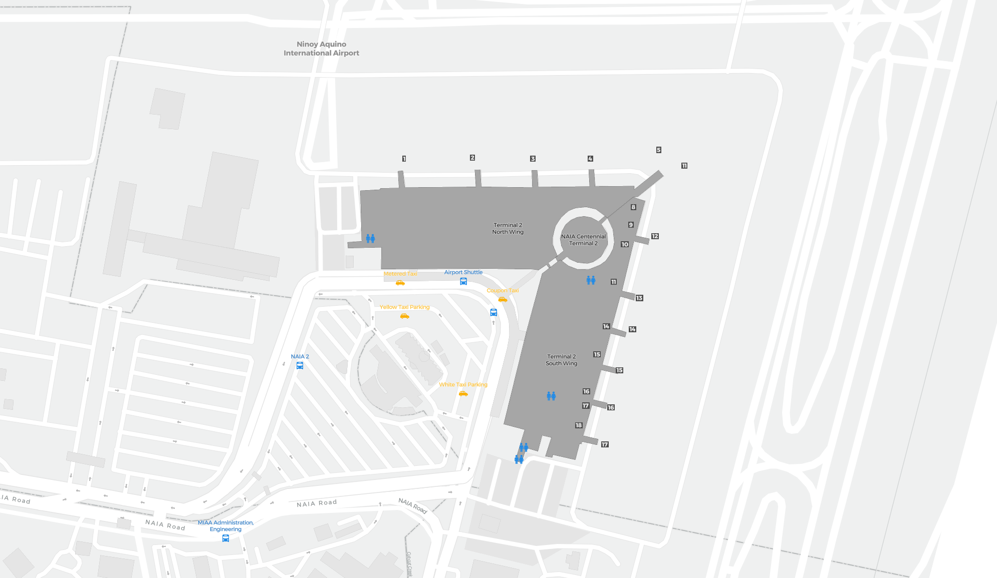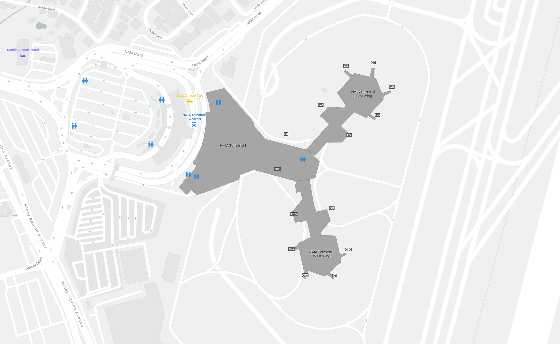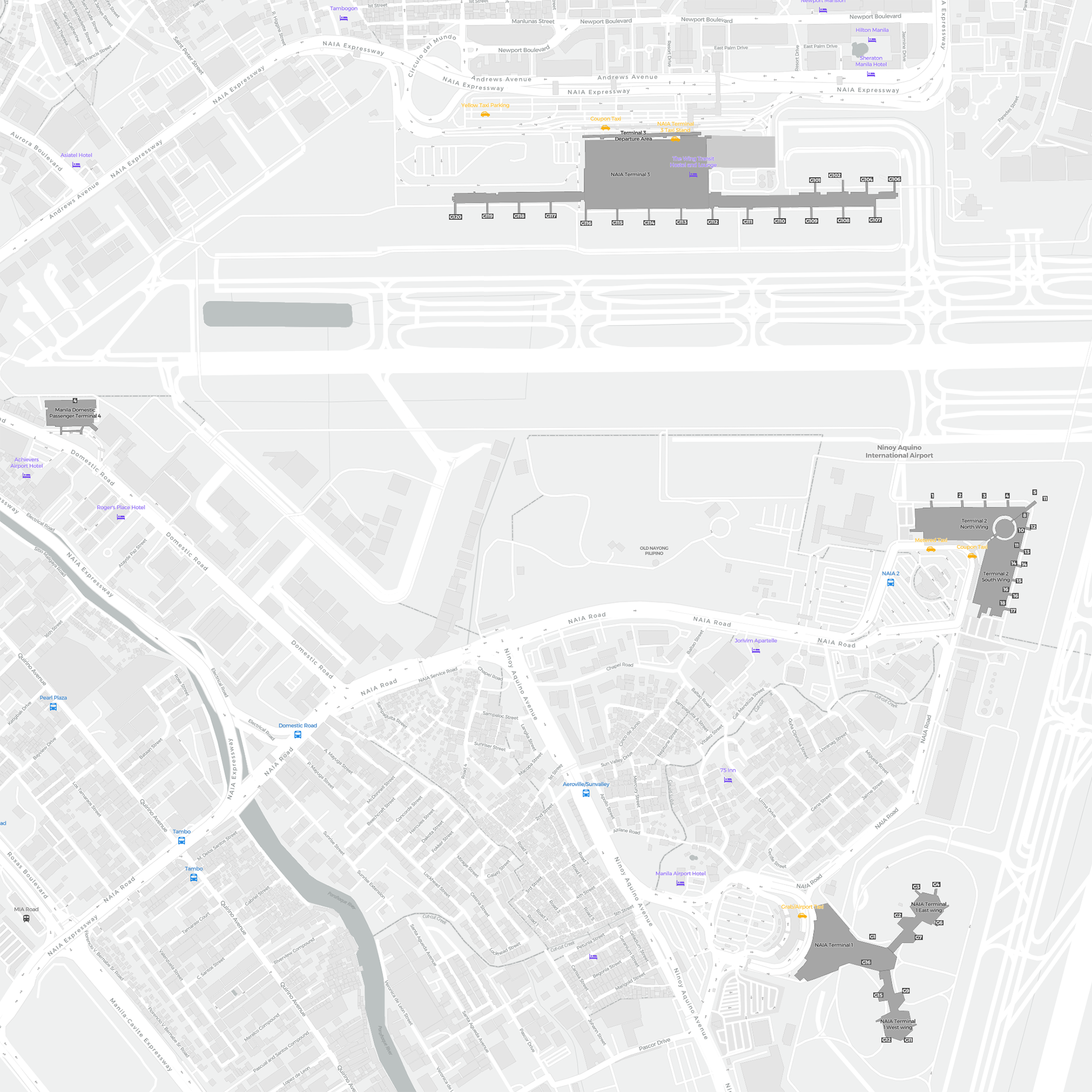 Tämä on zoomattava kartta Manila (MNL). Kartta voi antaa yleiskuvan ulkoalueesta terminaaleineen, pysäköintialueineen ja joissakin lentokentissä myös porttien, autovuokrauspalveluiden ja muiden mukavuuksien tiedot, jos zoomaat sisään.