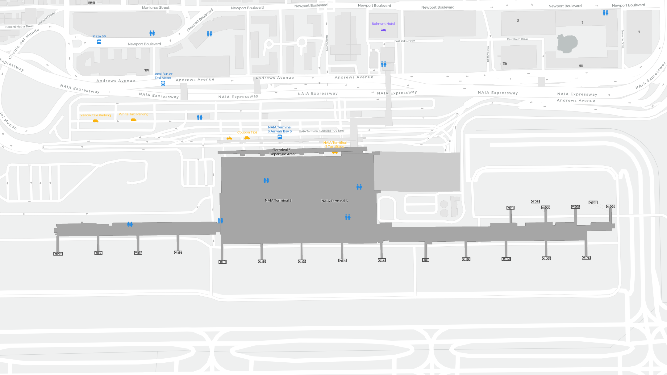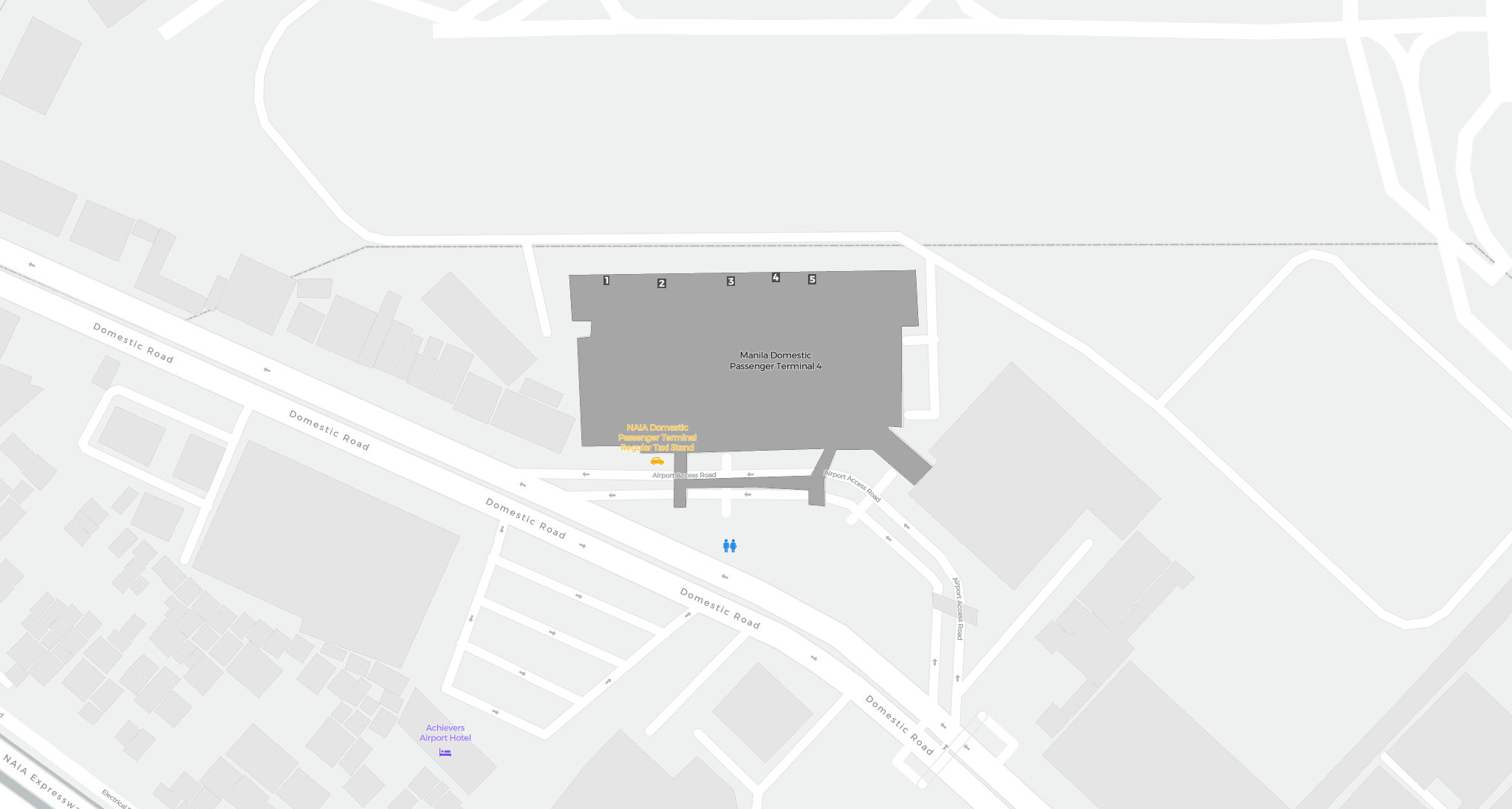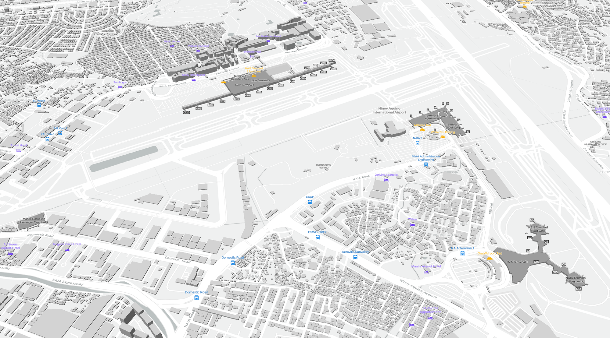 Tämä on zoomattava kartta Manila (MNL). Kartta voi antaa yleiskuvan ulkoalueesta terminaaleineen, pysäköintialueineen ja joissakin lentokentissä myös porttien, autovuokrauspalveluiden ja muiden mukavuuksien tiedot, jos zoomaat sisään.