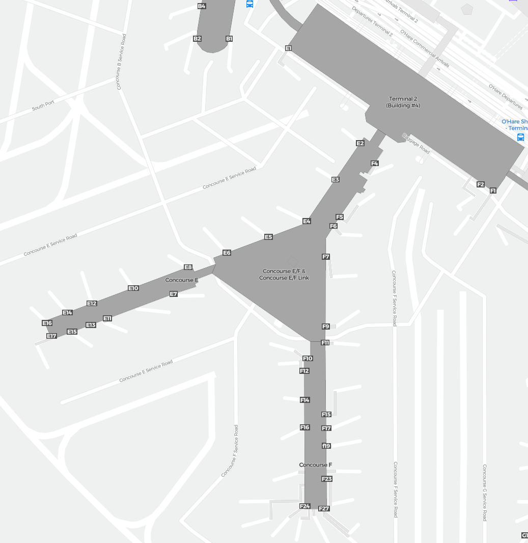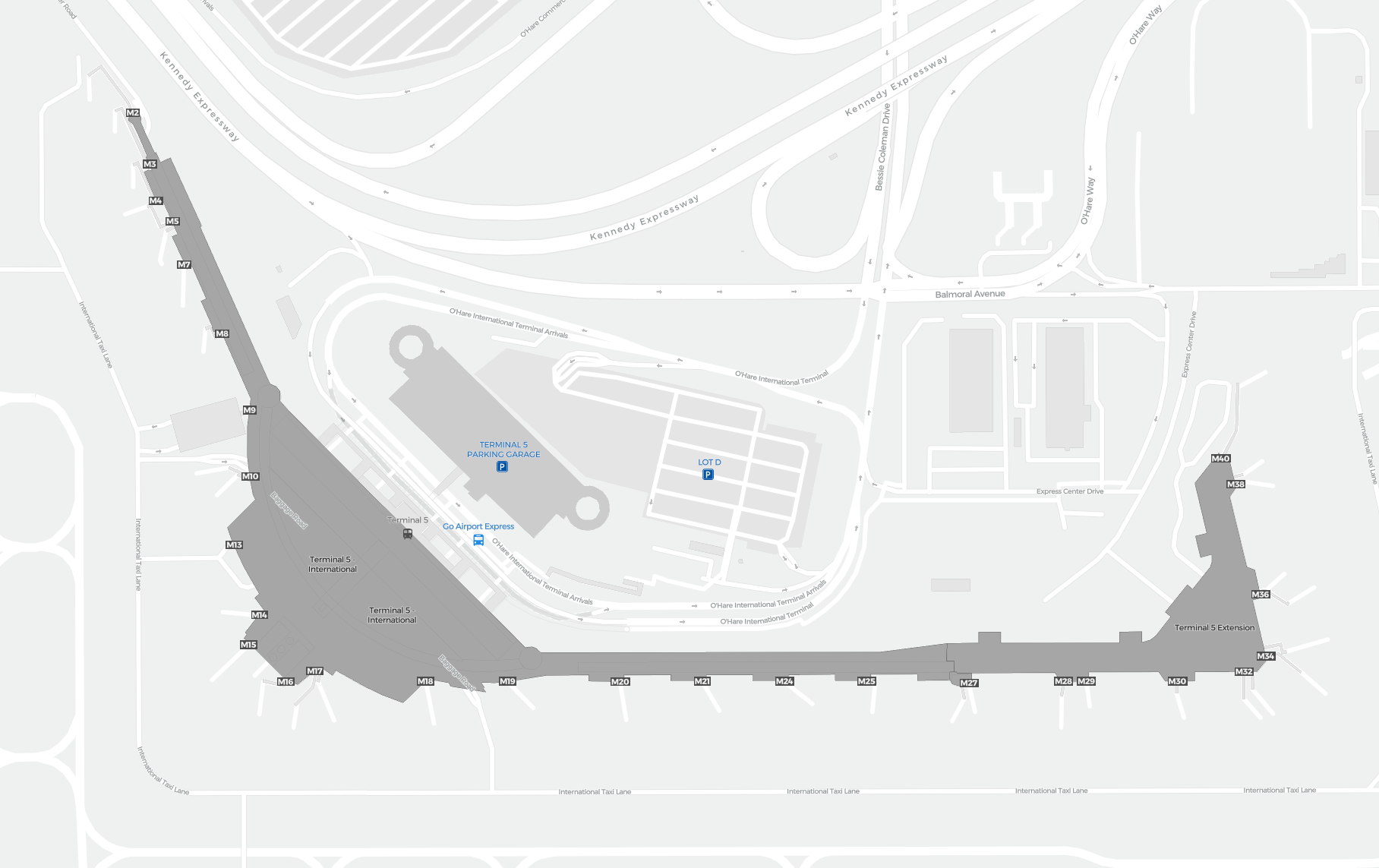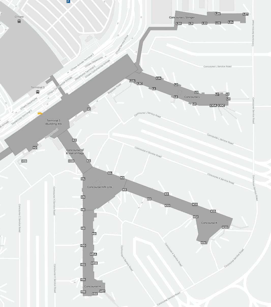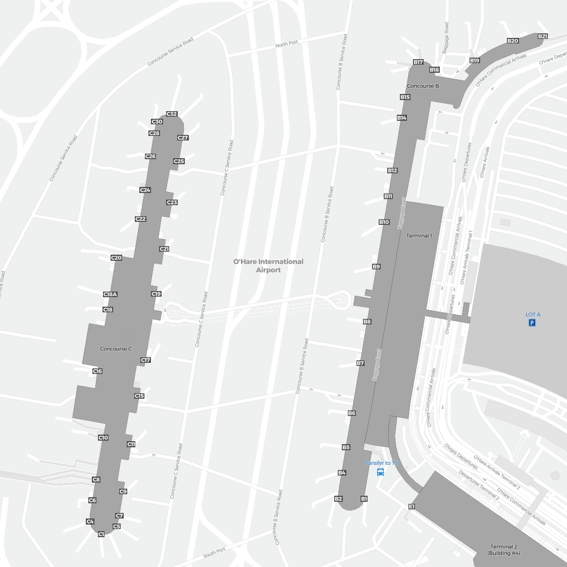 Tämä on zoomattava kartta Chicago (ORD). Kartta voi antaa yleiskuvan ulkoalueesta terminaaleineen, pysäköintialueineen ja joissakin lentokentissä myös porttien, autovuokrauspalveluiden ja muiden mukavuuksien tiedot, jos zoomaat sisään.
