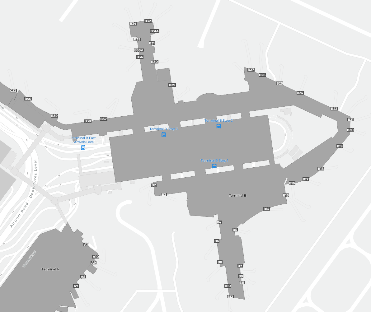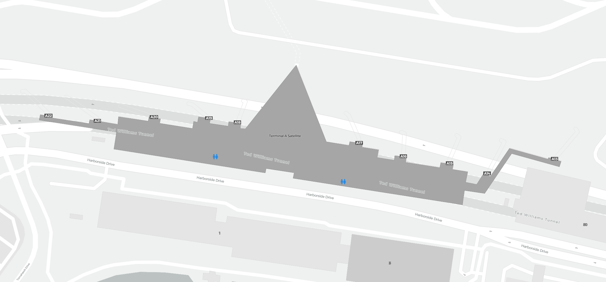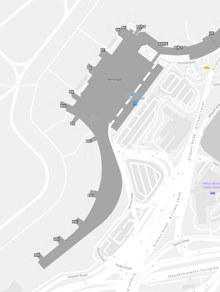 Tämä on zoomattava kartta Boston (BOS). Kartta voi antaa yleiskuvan ulkoalueesta terminaaleineen, pysäköintialueineen ja joissakin lentokentissä myös porttien, autovuokrauspalveluiden ja muiden mukavuuksien tiedot, jos zoomaat sisään.