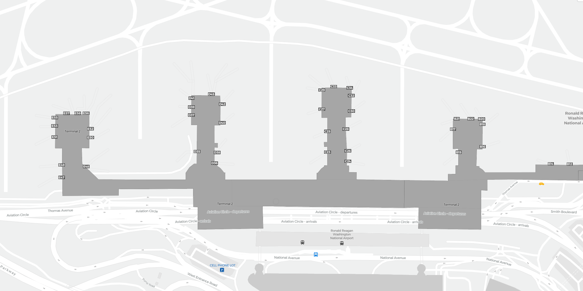 Tämä on zoomattava kartta Washington (DCA). Kartta voi antaa yleiskuvan ulkoalueesta terminaaleineen, pysäköintialueineen ja joissakin lentokentissä myös porttien, autovuokrauspalveluiden ja muiden mukavuuksien tiedot, jos zoomaat sisään.