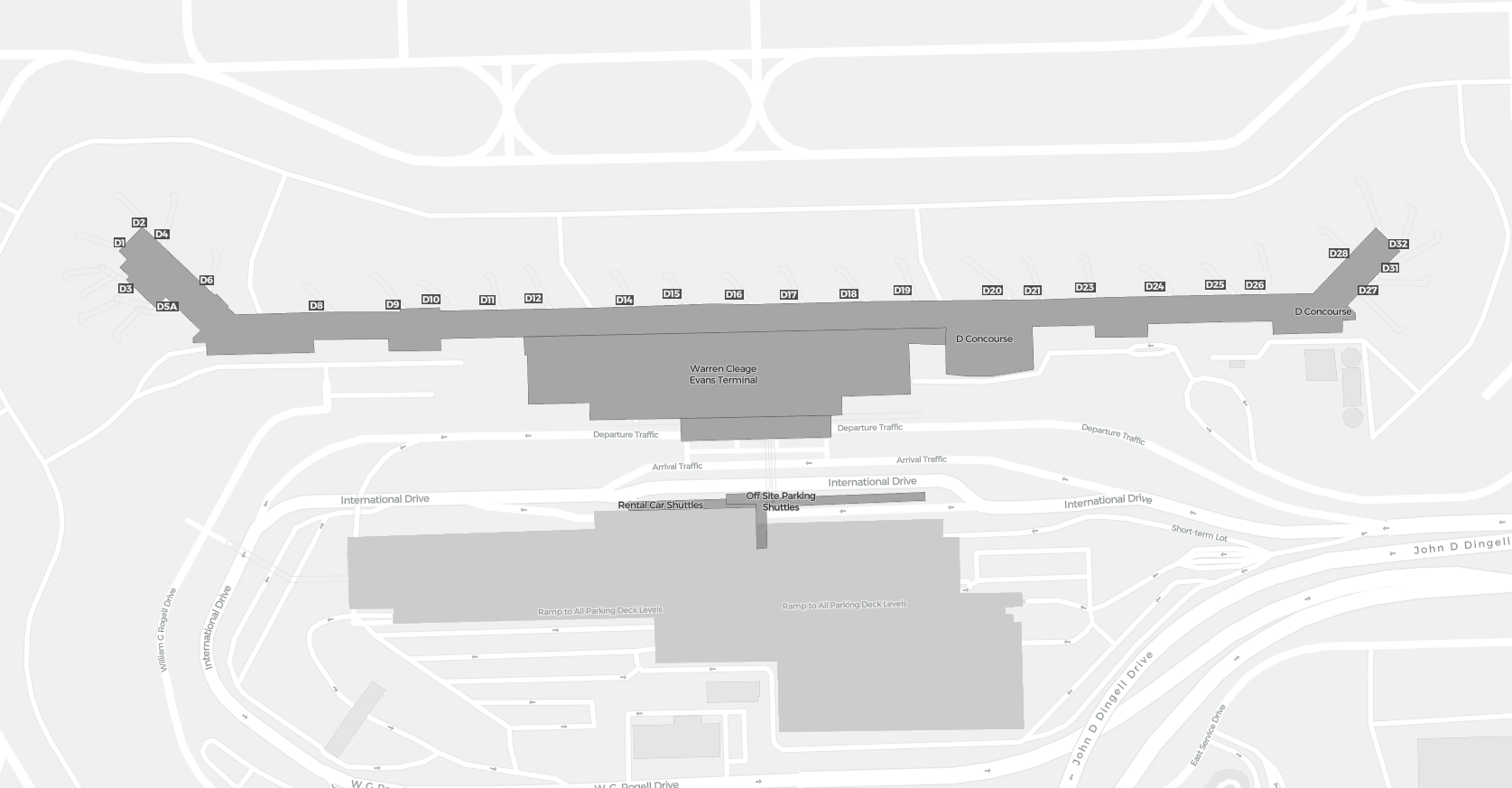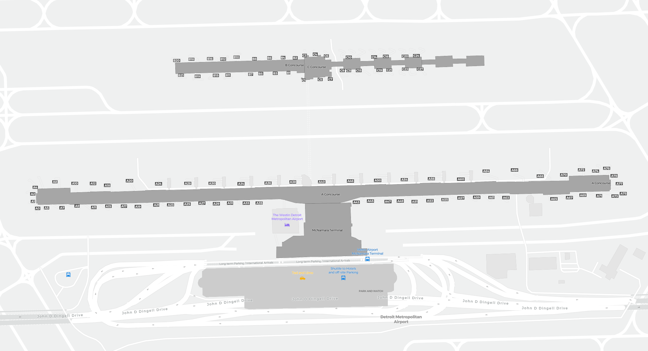 Tämä on zoomattava kartta Detroit (DTW). Kartta voi antaa yleiskuvan ulkoalueesta terminaaleineen, pysäköintialueineen ja joissakin lentokentissä myös porttien, autovuokrauspalveluiden ja muiden mukavuuksien tiedot, jos zoomaat sisään.