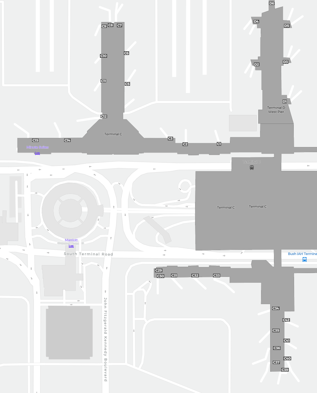 Tämä on zoomattava kartta Houston (IAH). Kartta voi antaa yleiskuvan ulkoalueesta terminaaleineen, pysäköintialueineen ja joissakin lentokentissä myös porttien, autovuokrauspalveluiden ja muiden mukavuuksien tiedot, jos zoomaat sisään.