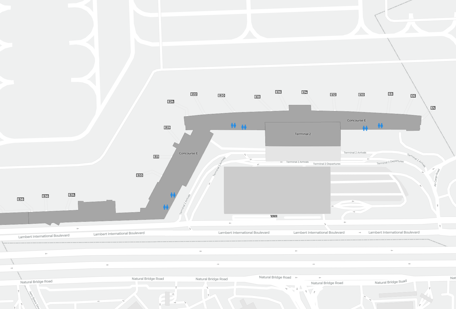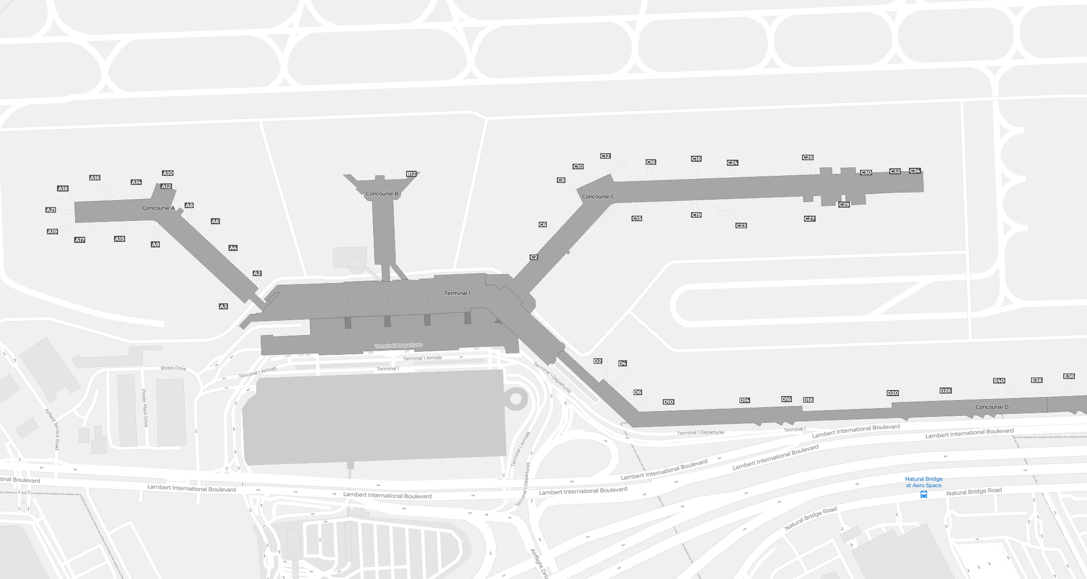 Tämä on zoomattava kartta Saint Louis (STL). Kartta voi antaa yleiskuvan ulkoalueesta terminaaleineen, pysäköintialueineen ja joissakin lentokentissä myös porttien, autovuokrauspalveluiden ja muiden mukavuuksien tiedot, jos zoomaat sisään.